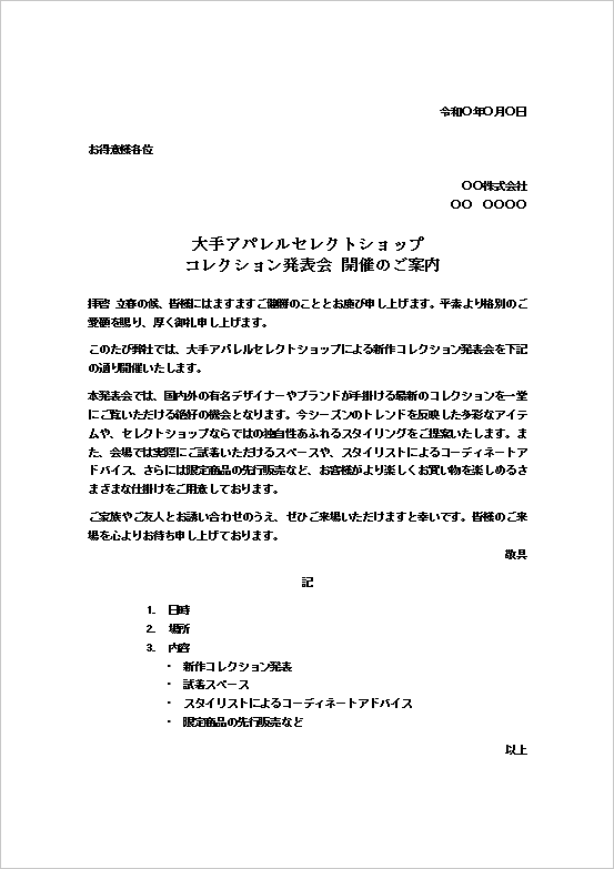 物産展・アパレルセレクトショップのコレクション発表会・クリスマス商品展示会・日用品仕入れ商談会など、シーンや目的に合わせてすぐに使えるWord形式の案内状テンプレートです。