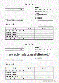 請求書 請求書No. 様発行日 平成 年 月 日 株式会社○○○○○ 〒123-4567 山口県山口市山口町山口12-34 山口ビル5F TEL 12-3456-7890 FAX 12-3456-7891 下記のとおり御請求もうしあげます 税込合計金額 項目 金額 備考 前月請求残高 別紙請求額 (請求No.) 別紙請求額 (請求No.) 消費税額等(税率%) 当月請求額 |
